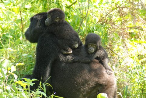 As Bahati tucks beneath the vegetation, Kwitonda emerges on the knob above us with her two fuzzy and precious packages clinging tightly to her back: the brother and sister twins Karunge and Muhozi, who were born just over a year ago.  Gorilla twins are rare. Rarer yet is both surviving past their first year.  Muhozi and Kaurunge both look healthy to these untrained eyes, and the rangers inform me they are doing just fine.