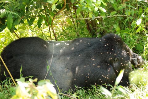 There is rustling all around us and we follow Kwitonda up the hill, but it is hard to spot anything in the wall of ferns and grass. As we double around and pass above the lounging Bahati we get lucky: there is Mama Christmas with her tiny two week-old baby, which she is vigilantly sheltering under her arm beneath her breast. My mission today was to get photos of the newborn, but I am no match for a protective mother: I can only get a few fleeting glances and blurry snaps before she whisks the fragile youngster through some dense brush and out of site.