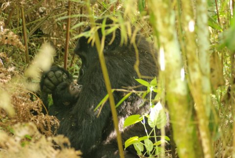Here, the HUGO (Human Gorilla Conflict) team, an IGCP assisted project springs into action using their extensive training to encourage the gorillas to re-enter the forest. When we finally reach the gullies beyond the bean fields (gorillas do not actually like the bean plants for food and leave them alone, the rangers tell me) the family has scattered, but still has time to be cheeky: the newly silvered silverback Bahati, who has graduated from blackback status the last time I saw him, still plays the rebellious teenager and starts chasing us through the rustling ferns, which have turned reddish-brown under the high country sun. After one or two bluffs, he settles into a spot near some tasty trees and ignores us, deciding a snack is more important than making this pale ape tumble backwards down the almost vertical slopes.