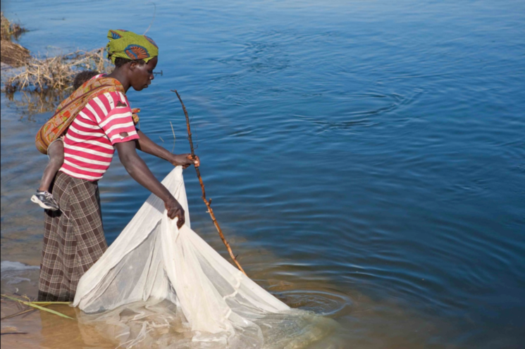 A woman fishes using mosquito netting in the Zambezi.