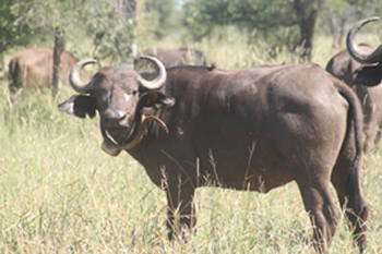 I decided to stay with the herd this time. There must have been around one hundred of them. The signal pointed directly into the herd. That was an interesting thing to see. I was wondering how I was going to explain this kind of behaviour. “A leopard that thinks he is a buffalo,” that would make a nice piece of story to tell. Suddenly the herd sort of moved and out walked this cow sort of trying to tell me not to get my hopes high about finding a leopard among the herd. Around her neck was a collar and the signal pointed directly at her. I took her picture and disappointed I headed back to the lodge. After that it became my routine, following a buffalo cow. It turns out that the telemetry equipment responded to the buffalo collar more than it did for the leopard collar. In the end Dr. Peter Buss decided it was enough and came and removed the buffalo collar.