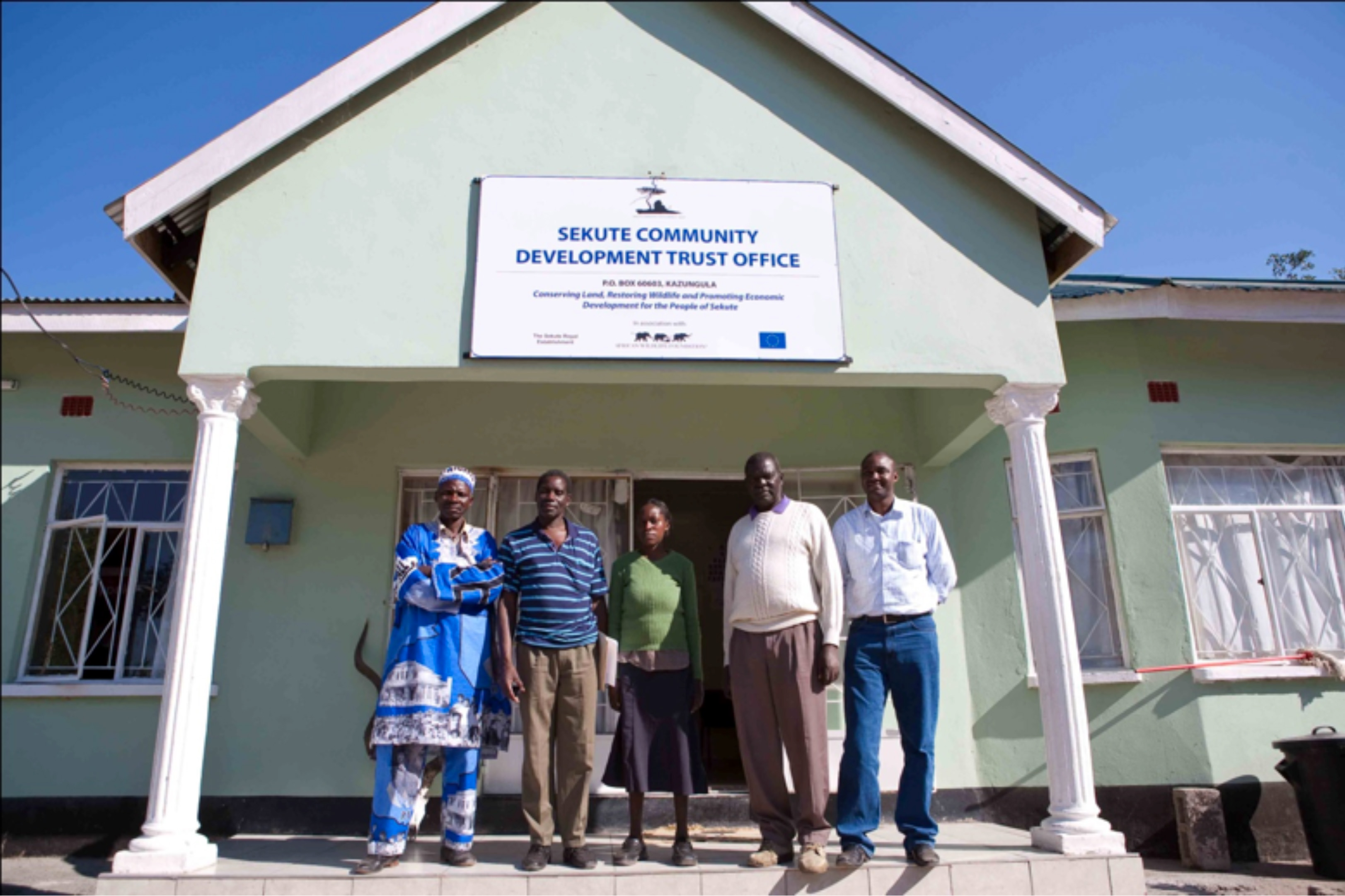 Members of the Trust and AWF Regional Enterprise Manager Wilfred stand in front of the new office for the Sekute Community Development Trust.