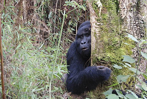 The wind picks up and howls as I scramble up the hill and catch Safari hiding behind a huge tree, poking his massive oblong head out from behind every once in awhile to check on the others. Gorillas love to snack on dead wood, and apparently Safari has found a treasure trove.