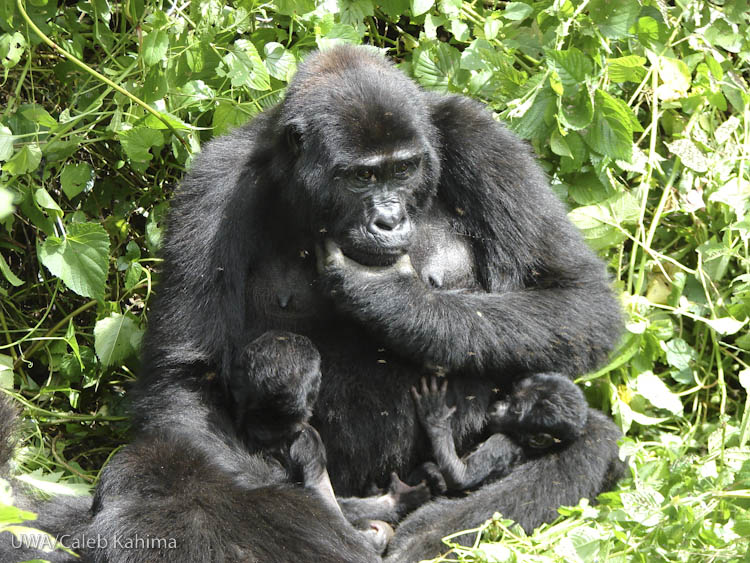 The twins are jealously guarded by Kwitonda and Safari, and sometimes are completely out of sight. Kwitonda, however, has decided to take a rest underneath some bushes on the steepest part of the ridge. Wiping away some branches, I get an obstructed view of two tiny furry lumps, clinging tightly to Kwitonda’s side and breast. They are scrawny, but look healthy, with thick spiked rock star hair and big bright eyes. Kwitonda doesn’t run, but seems determined to keep them out of sight of our prying eyes, inching further under the shady brush. A sturdy wind picks up and screams down the mountainside, prompting everyone to get up and head to calmer corners.