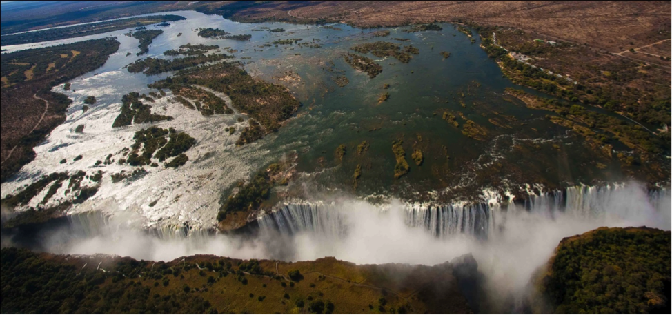 Victoria Falls is over 5,600 feet wide, and 350 feet tall: the largest sheet of falling water in the world. To the right is Zambia, and to the left is Zimbabwe, with paths on the banks opposite of the fall.
