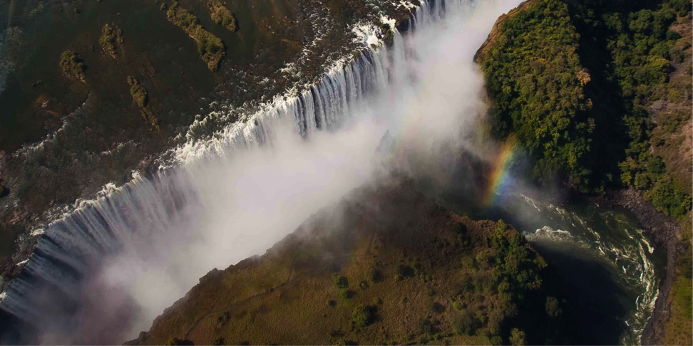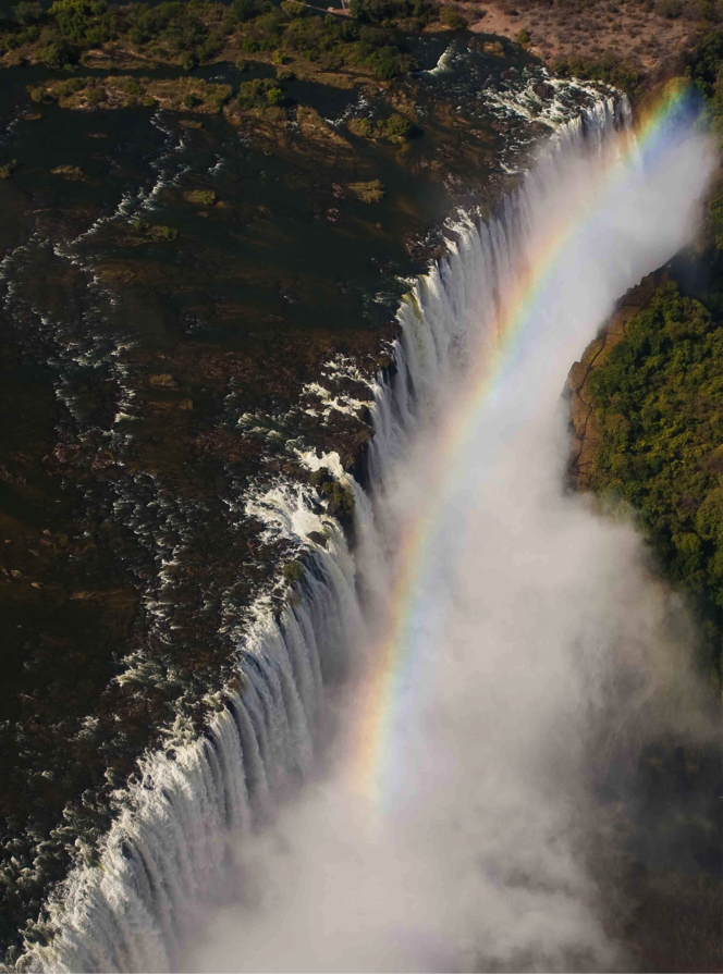 Flying over the fall you see where the Zambezi river makes its first turn after the fall, down on the right. Water and light combining, they create magnificent rainbows all around the fall, changing with each move we made.