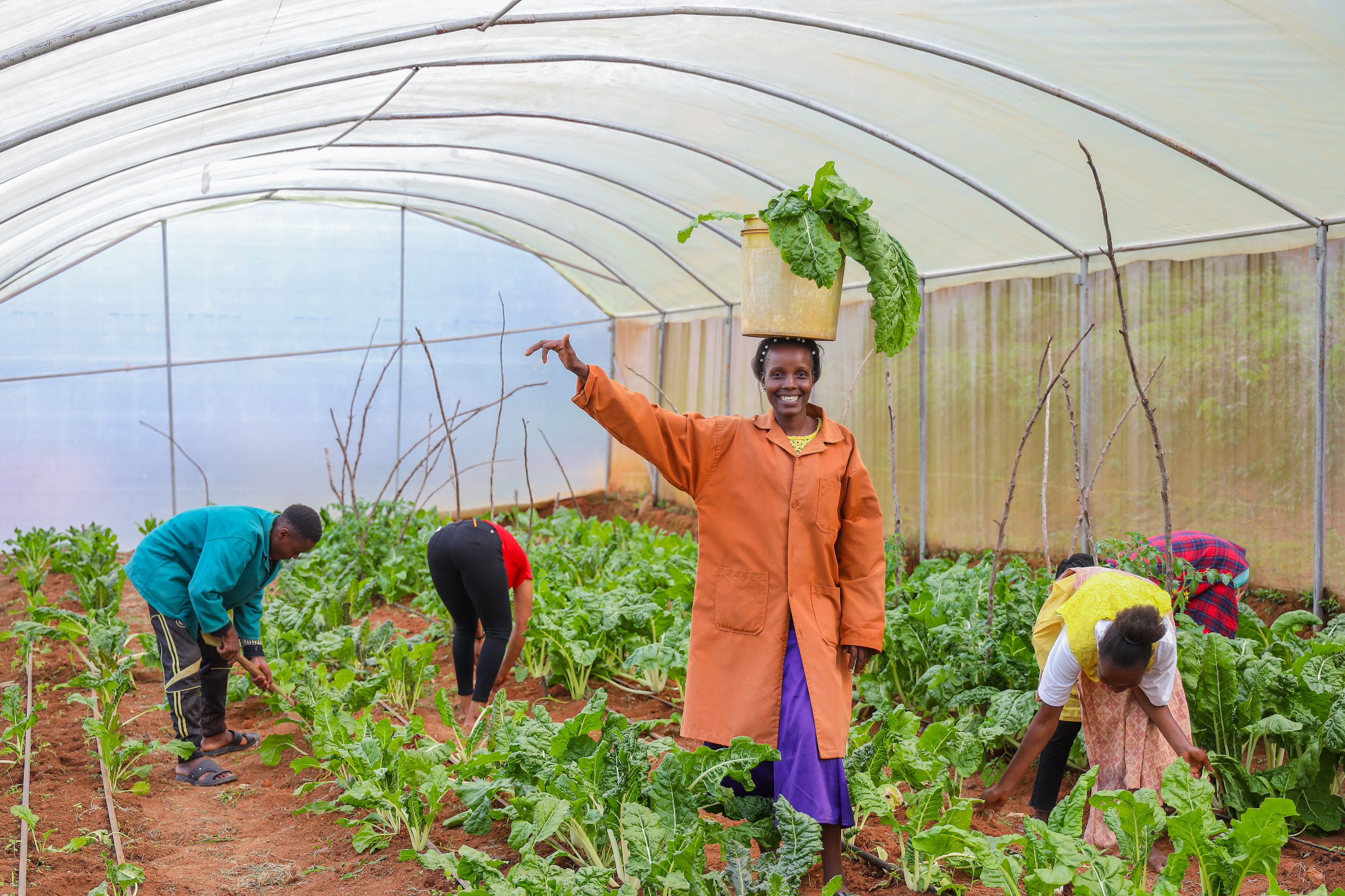 Jedida Mesi and the Mwavunyu Chakiloli Youth Group harvest fresh vegetables from their climate-smart greenhouse.