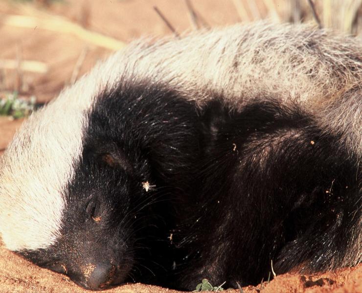 Ratels, also known as honey badgers, are muscular and compact, have a thick skull, a well-developed neck and shoulders, and strong forelegs armed with massive claws for digging. The striking pattern of the black lower body and white upper-body fur extends to the tail. It has internal ears that can be closed to keep out dirt while digging.